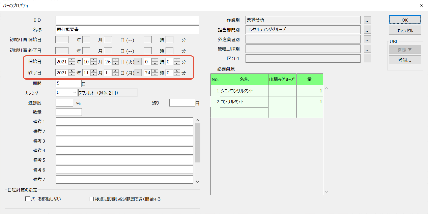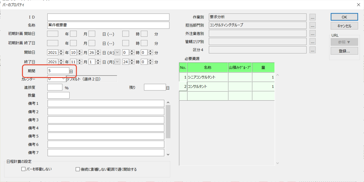 - バーのプロパティ画面から日数を指定して期間を変更できます。