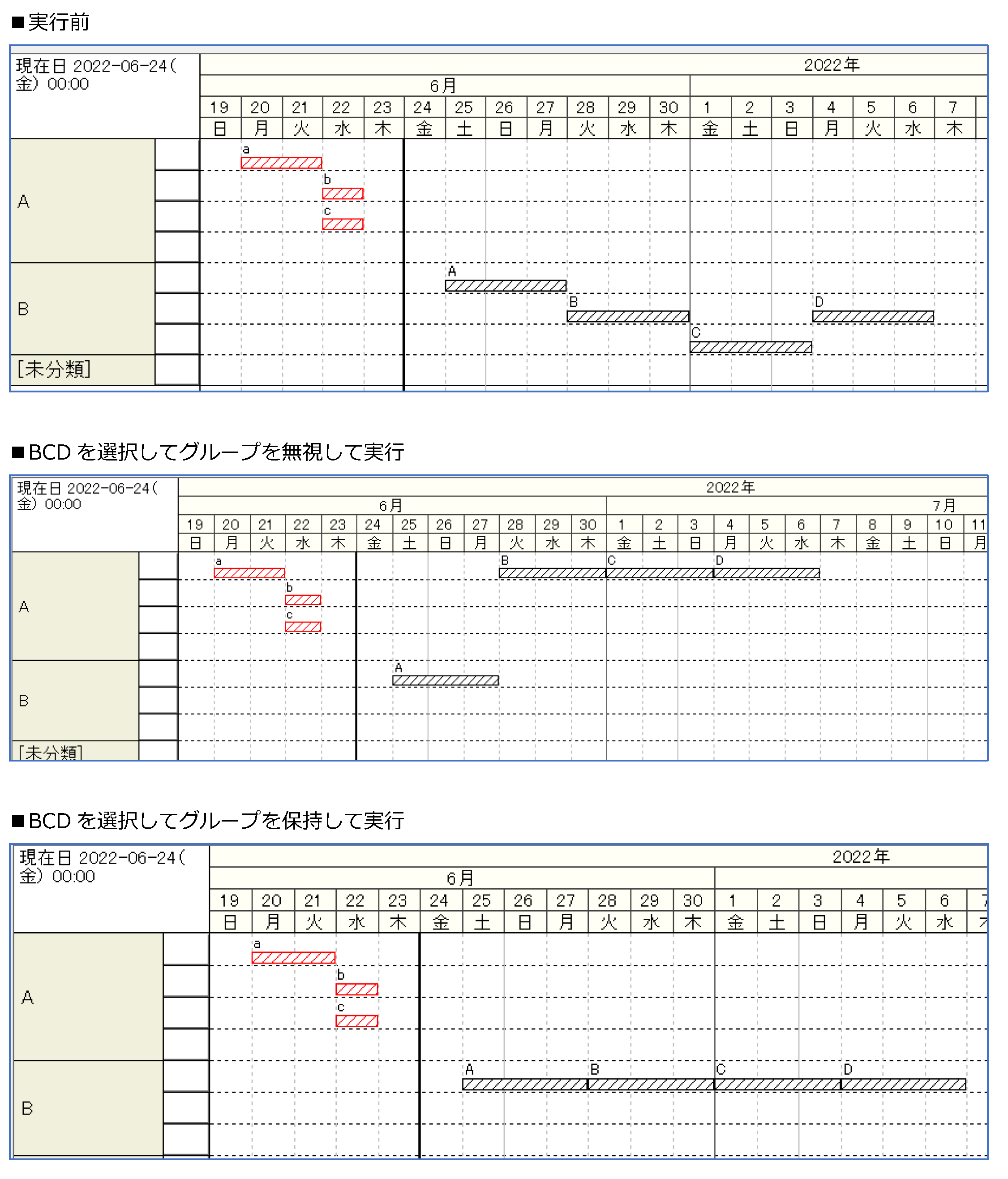 所属グループが異なる作業バーをまとめて選択した場合、グループ内で上詰めするか、グループを無視して上詰めするかを選択できます。