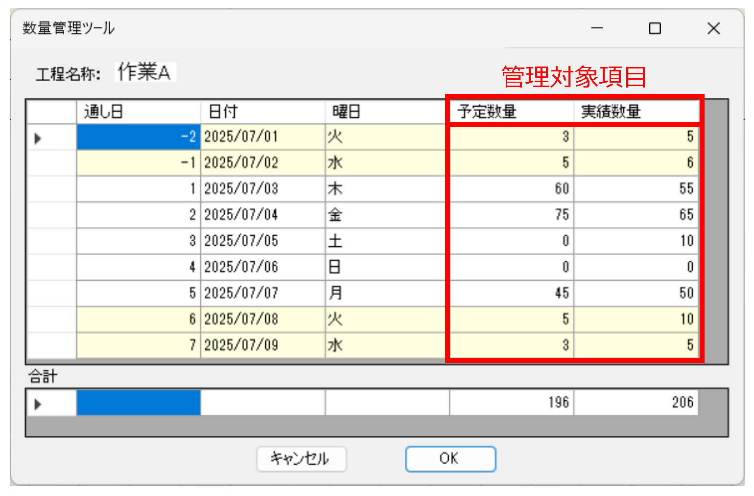 本ツールでは、工程表上の各バー(グループバーおよび作業バー)に対し、実績等の数量情報を日毎に入力・管理することができます。