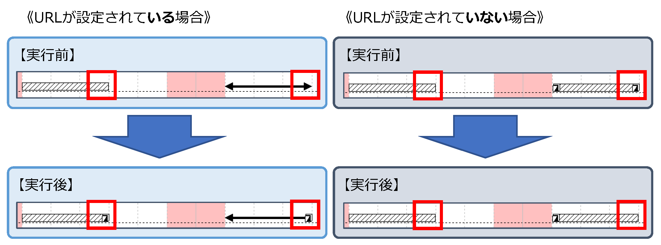 本ツールを実行すると、表示中のビュー内にあるすべての作業バーおよびグループバーについて、プロパティにURL(ファイルパスやウェブサイトなど)が設定されているかを確認し、以下の処理を行います。